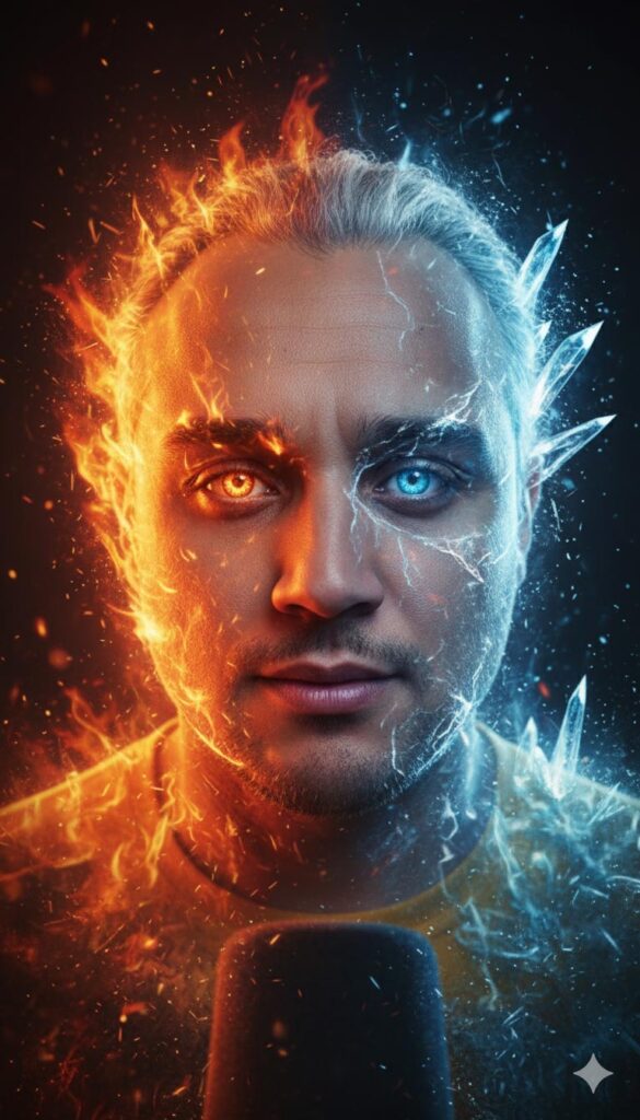 Modificador de fotografia: Retrato em plano médio (meio corpo), cena dividida ao meio por uma parede rústica central, com textura áspera, partes quebradas e imperfeições visíveis, criando um efeito sombrio e dramático.