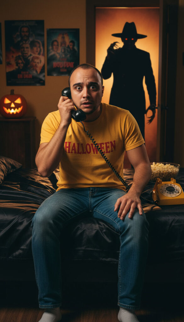 Qualidade: alta qualidade, fotografia em 8K, HDR, estilo de pôster de filme de terror.Roupa: camiseta amarela básica, estampada com a palavra “Halloween” em letras vermelhas, calça jeans simples e meias brancas.Cenário: quarto de terror estilizado, cama com lençol preto brilhante, tigela de pipoca ao lado do personagem, telefone fixo amarelo. Na parede ao fundo, pôsteres de filmes de terror icônicos. À esquerda, uma abóbora de Halloween iluminada sobre móvel escuro. Ao fundo, porta entreaberta mostrando a silhueta de um vilão clássico do terror (silhueta escura com chapéu e garras longas).Color Grading: tons quentes alaranjados no ambiente contrastando com sombras profundas; atmosfera sombria, com contraste alto para reforçar o suspense.Resultado: imagem épica, cinematográfica, ultrarrealista, com atmosfera de terror psicológico, mantendo meu rosto fielmente como protagonista.