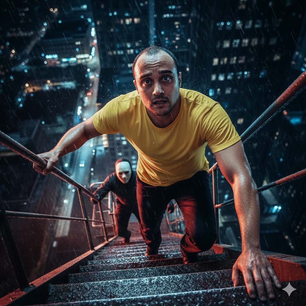 Fisionomia: Preservar fielmente meu rosto, proporções faciais, pele, cabelo e traços únicos. Estilo épico: Atmosfera de suspense intenso, realista e icônica, como pôster clássico de horror.