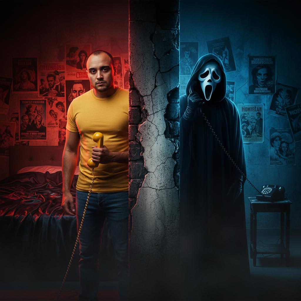 Roupa: Personagem principal com camiseta amarela básica justa e calça jeans azul, estilo casual. Ghostface com capa preta tradicional e máscara branca. Cenário: Lado esquerdo: quarto sombrio com cama de lençol preto acetinado e parede coberta por pôsteres clássicos de filmes de terror colados diretamente, em estilo caótico e vintage. Lado direito: ambiente frio com parede azulada também coberta por pôsteres colados, mesa pequena com telefone preto. Parede central: Iluminação mais escura, com a luz focada apenas no centro da parede, destacando a divisão entre os personagens, transmitindo suspense. Posição da câmera: Altura dos olhos, enquadramento frontal reto, estilo pôster cinematográfico. Iluminação: Dramática e contrastante — lado esquerdo em luz vermelha intensa, lado direito em luz azul fria, sombras marcantes, contraste forte. Adicionar um efeito de vinheta suave para direcionar o olhar ao centro. Iluminação spot suave, temperatura 5600K, direcionada para o rosto dos dois personagens. Atmosfera: Neblina suave preenchendo toda a cena, criando profundidade e realce cinematográfico, com atmosfera densa de suspense. Configuração de câmera: Foco nítido nos dois personagens, fundo ligeiramente desfocado, atmosfera cinematográfica de tensão. Lente: 50mm, estilo retrato dramático. Estilo de arte: Ultracine realista, pôster de filme de terror. Qualidade: HDR, 8K, iluminação de estúdio dramática, texturas detalhadas.