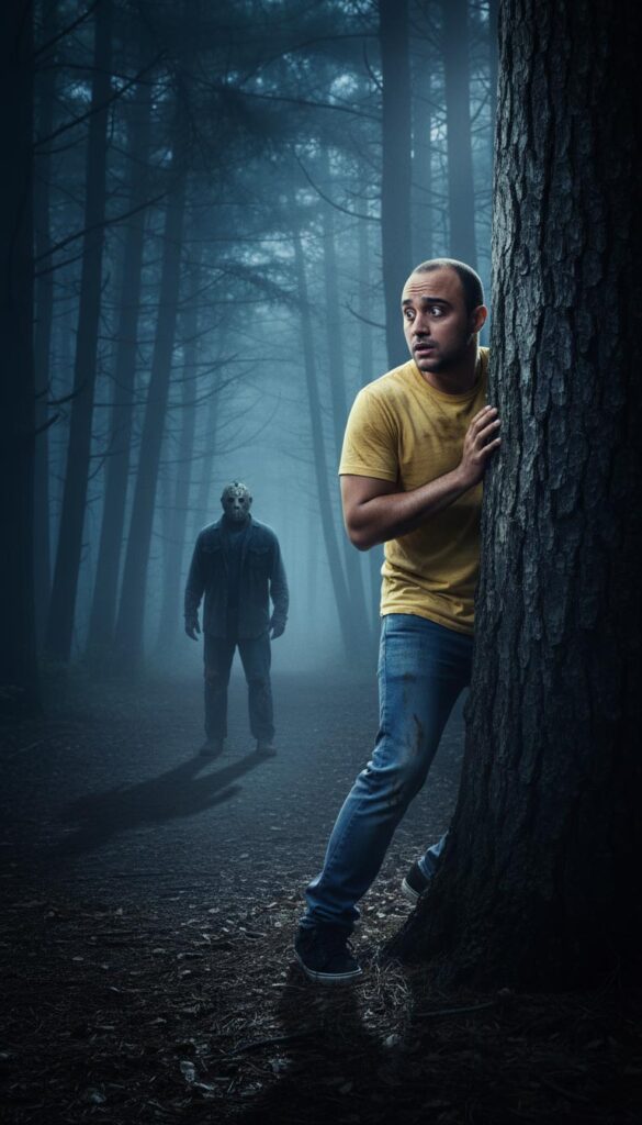 Crie uma imagem cinematográfica ultrarrealista em alta qualidade, recriando a cena com o meu rosto preservado fielmente, mantendo proporções faciais, tom de pele, e traços únicos. Modificador de fotografia: fotografia de suspense em plano médio, atmosfera de terror psicológico, estilo pôster de filme de horror. Pose: o personagem está escondido parcialmente atrás de uma árvore grossa, corpo levemente inclinado, mãos apoiadas no tronco, expressão de medo e tensão, respiração ofegante, olhos espiando em direção à estrada da floresta. Posição da câmera: câmera em nível dos olhos, perspectiva lateral, mostrando o personagem em primeiro plano atrás da árvore e ao fundo Jason Voorhees caminhando na estrada da floresta, como se estivesse à procura da vítima. Iluminação: dramática e volumétrica, atmosfera de floresta escura com névoa. Spotlight suave (5600K) ilumina parcialmente o rosto do personagem principal, enquanto Jason recebe luz fria e difusa da estrada. Contraste forte entre sombra e luz, aumentando a tensão. Configuração de câmera: foco nítido no personagem, fundo levemente desfocado mas reconhecível mostrando Jason; atmosfera enevoada, sombras alongadas no chão, sensação de profundidade cinematográfica. Lente: grande angular 35mm f/1.8, criando tensão visual entre primeiro e segundo plano. Estilo de arte: realista cinematográfico, pôster de filme clássico de terror. Qualidade: ultrarrealista, 8K, HDR, iluminação de estúdio dramática, materiais PBR, texturas detalhadas de pele, árvore e roupas. Roupa do personagem: camisa amarela básica levemente suja de lama, calça jeans azul, tênis preto simples, levemente sujos pela floresta.Cenário: floresta densa e escura, árvores retorcidas, chão coberto por folhas secas, estrada estreita de floresta ao fundo. Jason Voorhees aparece de pé na estrada, usando máscara de hóquei e roupas escuras desgastadas, transmitindo ameaça.Color grading: paleta fria de azul-escuro misturada a sutis tons avermelhados nas sombras, efeito glow discreto em áreas iluminadas, atmosfera volumétrica enevoada, vinheta natural direcionando atenção ao personagem escondido e Jason ao fundo.Resultado esperado: imagem épica e cinematográfica de terror, tensão máxima, como um pôster de filme, em que Jason parece prestes a encontrar o personagem principal.