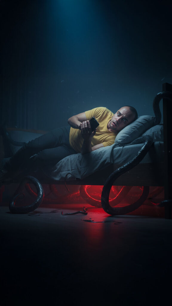Iluminação: atmosfera sombria e cinematográfica. Ambiente em tom azulado frio. Spot suave de luz 5600K ilumina apenas o rosto assustado, destacando feições tensas. Um abajur lateral emite brilho fraco e limitado. O quarto é dominado por sombras. Sob a cama, uma luz avermelhada intensa cria contraste frio/quente. Neblina suave reforça o suspense.Tentáculos: alongados, sinuosos e inquietantes, com superfície úmida e reflexiva. Alguns se enrolam no pé da cama, outros deslizam pelo chão deixando marcas sutis. Alguns estendem-se em direção ao personagem, quase tocando o lençol, aumentando a tensão. Pequenos brilhos e vapores difusos sugerem energia misteriosa emanando deles.Configuração da Câmera: foco nítido no personagem assustado e nas formas emergentes; fundo desfocado. Atmosfera volumétrica, sombras densas e contraste forte, sugerindo claustrofobia.Tipo de Lente: grande angular 35 mm, capturando toda a cena com perspectiva dramática.Estilo de Arte: realismo cinematográfico ultrarrealista, terror psicológico.Qualidade: HDR, 8K, detalhamento da pele, tecidos, sombras e textura orgânica dos elementos.Color Grading: tons frios azulados predominam no ambiente, cortados por luz vermelha difusa sob a cama. O brilho avermelhado se espalha pelo chão e reflete sutilmente no rosto assustado do personagem, reforçando o suspense.