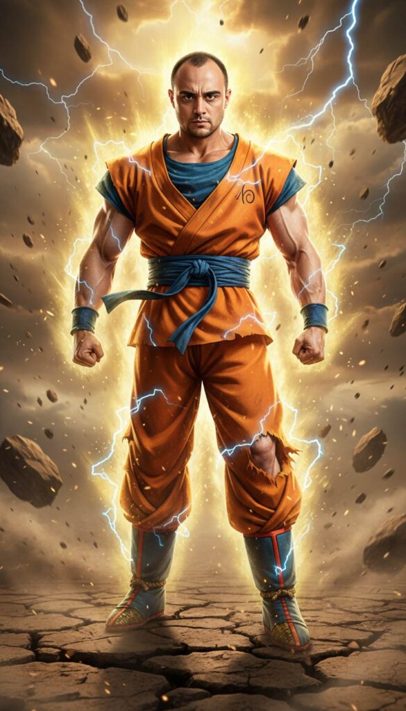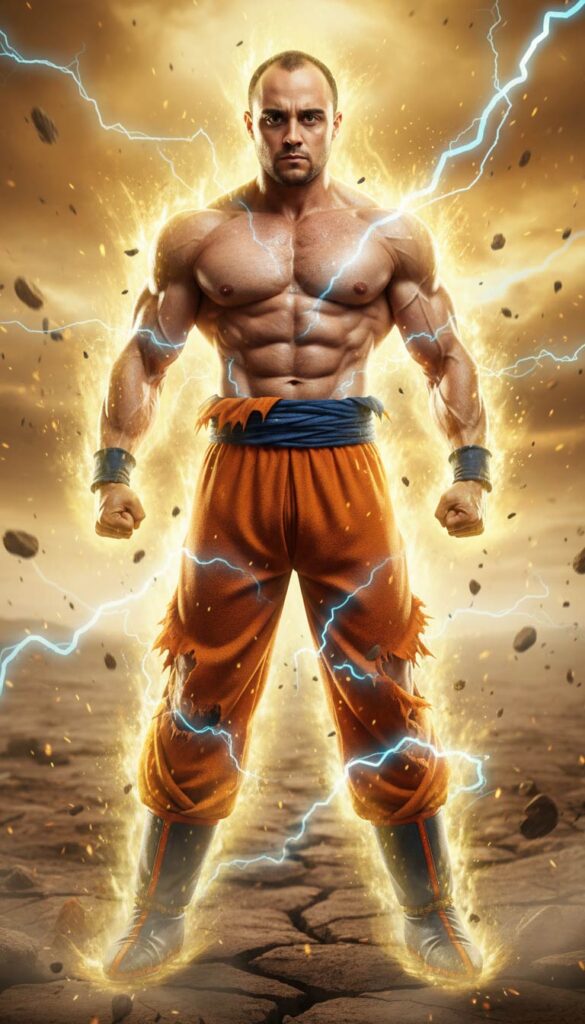 Crie uma imagem, com a foto enviada, cinematográfica em 8K ultrarrealista, de um homem adulto real, mantendo fisionomia original: pele, proporções e feições naturais, sem alterar rosto, olhos, boca. Expressão séria e olhar intenso voltado para frente, transmitindo poder, foco e determinação.Pose: corpo firme, punhos cerrados junto à cintura, músculos tensionados e veias levemente salientes pelo esforço. O vento energético sopra contra o corpo, levantando poeira e partículas.Cenário: planície rochosa realista, com chão rachado, pedras flutuando e ventos turbulentos girando em torno do personagem. O céu é dourado e caótico, cortado por relâmpagos azuis e iluminado por luz volumétrica intensa.Aura: energia dourada vibrante envolvendo todo o corpo, com raios elétricos azuis e partículas incandescentes flutuando no ar. A aura emite brilho pulsante que reflete no rosto, no solo e nas partículas suspensas, criando contraste épico entre tons quentes e frios.Roupa: parte superior do traje rasgada pela força da energia — o personagem está sem camisa, com fragmentos do tecido flutuando no ar. Resto do uniforme mantém a base original: faixa azul na cintura, calça laranja com textura PBR realista e botas com detalhes dourados. O corpo exibe definição muscular realista, com iluminação cinematográfica realçando textura de pele, suor e reflexos da energia dourada.Iluminação: luz intensa da aura reflete na pele e no solo, criando brilho dinâmico e dispersão de luz realista. Contraste cinematográfico entre luz dourada quente e relâmpagos frios azulados.Câmera: simulada com Canon EOS R5, lente 50mm f/1.8, foco nítido no rosto e no tronco, bokeh cinematográfico suave e desfoque atmosférico natural no fundo.Ângulo: baixo e frontal, transmitindo imponência e poder absoluto.Estilo: cinematográfico ultrarrealista, renderização física (PBR), HDR, microdetalhes de pele, partículas e energia. A cena transmite intensidade, transcendência e força bruta canalizada.