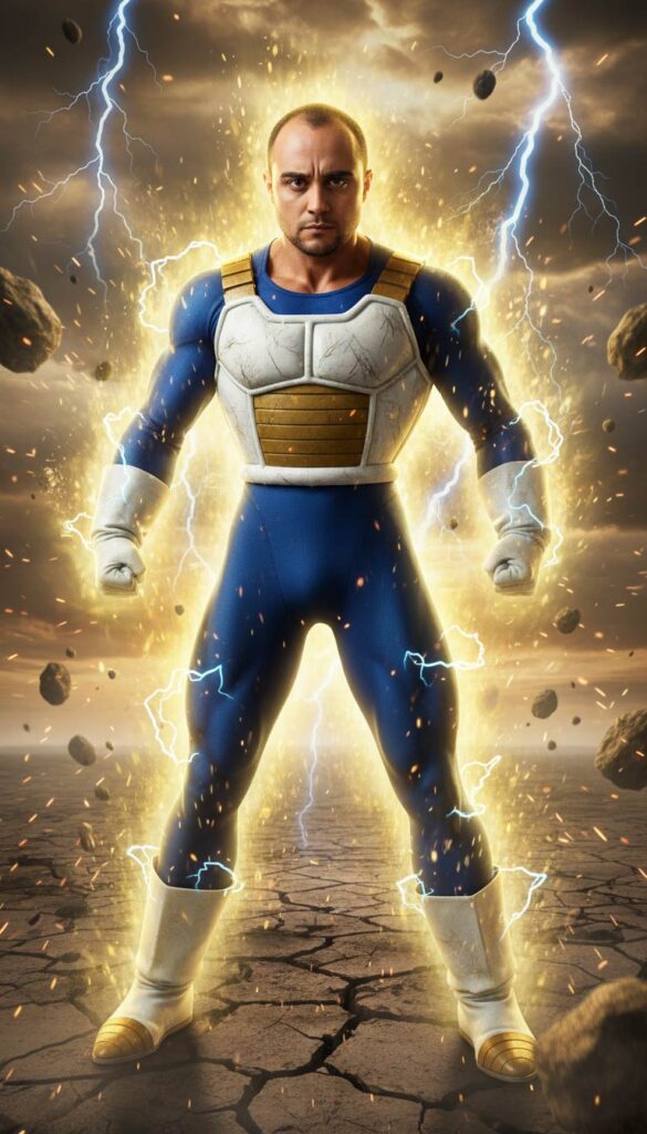 Crie uma imagem, com a foto enviada, cinematográfica em 8K ultrarrealista, de um homem adulto real, mantendo fisionomia original: pele, proporções e feições naturais. Expressão séria e olhar intenso voltado para frente, transmitindo força, orgulho e determinação.Pose: corpo firme, levemente inclinado para frente, punhos cerrados junto à cintura, músculos tensionados, postura de poder.Cenário: planície rochosa realista com chão rachado e pedras flutuando ao redor, vento energético levantando poeira e faíscas. O céu é dourado e turbulento, cortado por relâmpagos azuis e luz volumétrica cinematográfica.Aura: energia dourada intensa envolvendo o corpo, com raios elétricos azuis e partículas incandescentes flutuando no ar. A iluminação da aura reflete no rosto e na roupa, criando contraste épico entre tons quentes e frios.Roupa: traje clássico de Vegeta — armadura azul justa com textura PBR realista, ombreiras brancas reforçadas com detalhes dourados e placa peitoral de combate, luvas brancas com leve brilho especular e botas brancas com acabamento dourado. O tecido e o material da armadura exibem desgaste sutil e movimento causado pelo vento energético.Câmera: simulada com Canon EOS R5, lente 50mm f/1.8, foco nítido no rosto e na aura, com bokeh cinematográfico suave e leve desfoque atmosférico no fundo.Ângulo: baixo e frontal, criando escala heroica e imponência visual.Estilo: cinematográfico ultrarrealista, renderização física (PBR), HDR, microdetalhes de pele, iluminação subsuperficial e texturas realistas de metal e tecido.