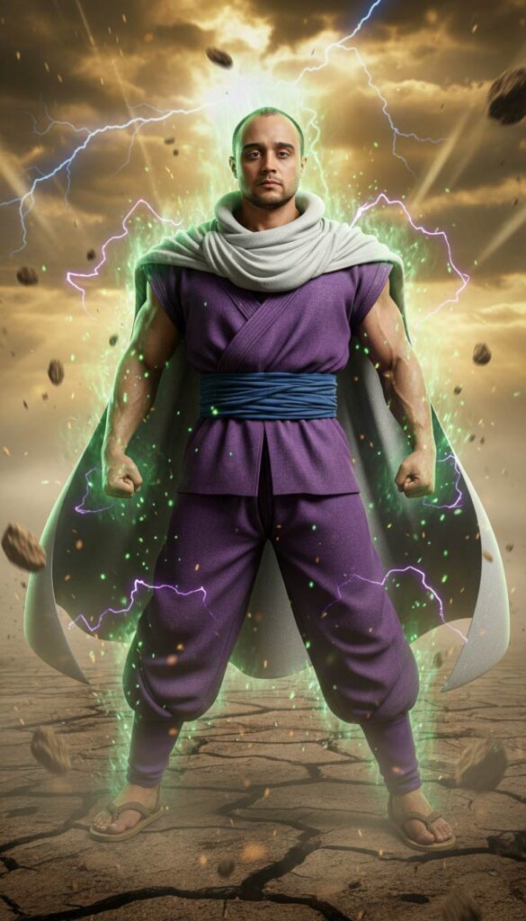 Crie uma imagem, com a foto enviada, cinematográfica em 8K ultrarrealista, de um homem adulto real, mantendo fisionomia original: pele, proporções e feições naturais, sem alterações. Expressão séria e olhar intenso voltado para frente, transmitindo serenidade, poder e foco absoluto.Pose: corpo firme, levemente inclinado para frente, punhos cerrados ao lado do corpo, músculos tensionados e postura de guerreiro concentrado.Cenário: planície rochosa detalhada com chão rachado, vento energético levantando poeira e pedras flutuando ao redor. O céu é dourado e turbulento, com relâmpagos azuis e feixes de luz volumétrica atravessando as nuvens.Aura: energia verde intensa misturada com raios elétricos roxos e partículas incandescentes flutuando no ar, com dispersão de luz realista. A iluminação da aura reflete no rosto e nas roupas, criando contraste cinematográfico entre tons frios e quentes.Roupa: traje tradicional de Piccolo — túnica roxa de tecido grosso com textura PBR realista, marcada por dobras naturais e desgaste leve nas bordas. Faixa larga azul-escura na cintura com amarração detalhada, calças amplas e sandálias marrons. O pano se move levemente com o vento energético, simulando peso e fluidez. Se desejar, pode incluir o manto branco com gola alta e caimento heroico, esvoaçando pelo vento, com textura têxtil realista e leve transparência na iluminação de fundo.Câmera: simulada com Canon EOS R5, lente 50 mm f/1.8, foco nítido no rosto e na aura, bokeh cinematográfico suave, desfoque atmosférico natural no fundo.Ângulo: baixo e frontal, transmitindo imponência e serenidade.Estilo: cinematográfico ultrarrealista, renderização física (PBR), HDR, iluminação subsuperficial e microdetalhes de pele e tecido, com composição heroica e contraste épico entre luz dourada e energia verde.