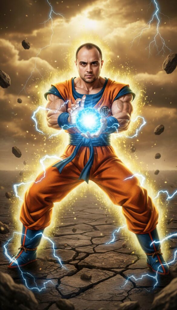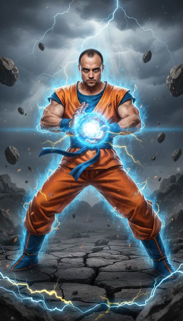 Crie uma imagem, com a foto enviada, cinematográfica em 8K ultrarrealista, de um homem adulto real, mantendo fisionomia original: pele, proporções e feições naturais. Expressão séria e olhar concentrado voltado para frente, transmitindo poder e foco absoluto.Pose: corpo firme e levemente inclinado para frente, pés afastados em posição de base, braços estendidos à frente com as mãos unidas formando o clássico gesto de concentração de energia do Kamehameha. Os músculos estão tensionados, o vento energético sopra em torno do corpo e partículas flutuam no ar.Cenário: planície rochosa épica, com chão rachado e pedras flutuando devido à intensidade do poder. O céu é dramático e turbulento com tons cinza e nuvens carregadas, cortado por relâmpagos azuis e nuvens em movimento, iluminadas por luz volumétrica cinematográfica.Aura: energia azul intensa concentrando-se nas palmas das mãos, formando uma esfera de energia brilhante com núcleo branco-azulado e bordas luminosas em espiral. Raios elétricos azuis e dourados emanam da esfera e percorrem o chão ao redor. O corpo é envolvido por uma aura azul vibrante, misturada com energia azul, criando um contraste visual poderoso.Iluminação: luz intensa proveniente da esfera de energia ilumina o rosto e o uniforme, criando reflexos realistas e contraste entre tons quentes e frios. A iluminação global é cinematográfica, com brilho HDR, dispersão subsuperficial e partículas de poeira iluminadas.Roupa: quimono laranja com faixa azul e camiseta azul por baixo, tecido PBR realista com textura, rugas e desgaste sutil. Botas com detalhes dourados e reflexos do brilho do Kamehameha.Câmera: simulada com Canon EOS R5, lente 50mm f/1.8, foco nítido no rosto e na esfera de energia, bokeh suave e desfoque atmosférico natural no fundo.Ângulo: baixo e frontal, captando toda a imponência do personagem concentrando o ataque.Estilo: cinematográfico ultrarrealista, renderização física, HDR, dispersão de luz e microdetalhes em pele, tecido e energia. A cena transmite tensão, poder e realismo épico.