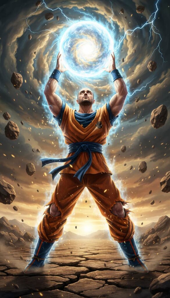 Crie uma imagem, com a foto enviada, cinematográfica em 8K ultrarrealista, de um homem adulto real, mantendo fisionomia original: pele, proporções e feições naturais, sem alterações. Expressão séria e olhar voltado para o alto, transmitindo foco absoluto, poder e sacrifício.Pose: corpo firme, em posição de base estável, pernas afastadas e levemente dobradas, braços totalmente erguidos acima da cabeça com as palmas abertas, concentrando energia. Os músculos estão tensionados e o vento energético sopra com força, levantando poeira e fragmentos do solo.Cenário: planície rochosa devastada, chão rachado e pedras flutuando no ar devido à força gravitacional da energia concentrada. O céu é dourado e turbulento, com relâmpagos azuis e ventos circulares formando uma espiral luminosa. Nuvens são atraídas para o centro da energia no alto, com luz volumétrica e partículas flutuantes intensas.Aura: energia azulada e branca intensa envolvendo o corpo, com raios elétricos dourados circulando ao redor. No topo, uma enorme esfera de energia (Genkidama) brilha com luz branca-azulada incandescente, núcleo pulsante e bordas translúcidas com partículas de energia fluindo em espiral. Reflexos da Genkidama iluminam o rosto, as roupas e o terreno, criando uma atmosfera divina e heroica.Iluminação: cinematográfica HDR — luz principal proveniente da Genkidama, emitindo brilho volumétrico que destaca o rosto, os braços e a textura do tecido. Contraste quente/frio com reflexos dourados no solo rachado e névoa energética azulada flutuando no ar.Roupa: quimono laranja com faixa azul e camiseta azul por baixo, tecido PBR realista com textura de algodão desgastado e movimento natural causado pelo vento energético. Botas com detalhes dourados e reflexos da luz da Genkidama.Câmera: simulada com Canon EOS R5, lente 50mm f/1.8, foco nítido no rosto e nas mãos erguidas, profundidade de campo cinematográfica, bokeh suave e leve desfoque atmosférico.Ângulo: baixo, frontal e ligeiramente inclinado para cima, enfatizando a escala épica da Genkidama e a imponência do personagem.Estilo: cinematográfico ultrarrealista, renderização física (PBR), HDR, iluminação global realista, dispersão subsuperficial e microdetalhes de pele e tecido. A cena transmite energia cósmica, esperança e poder supremo.