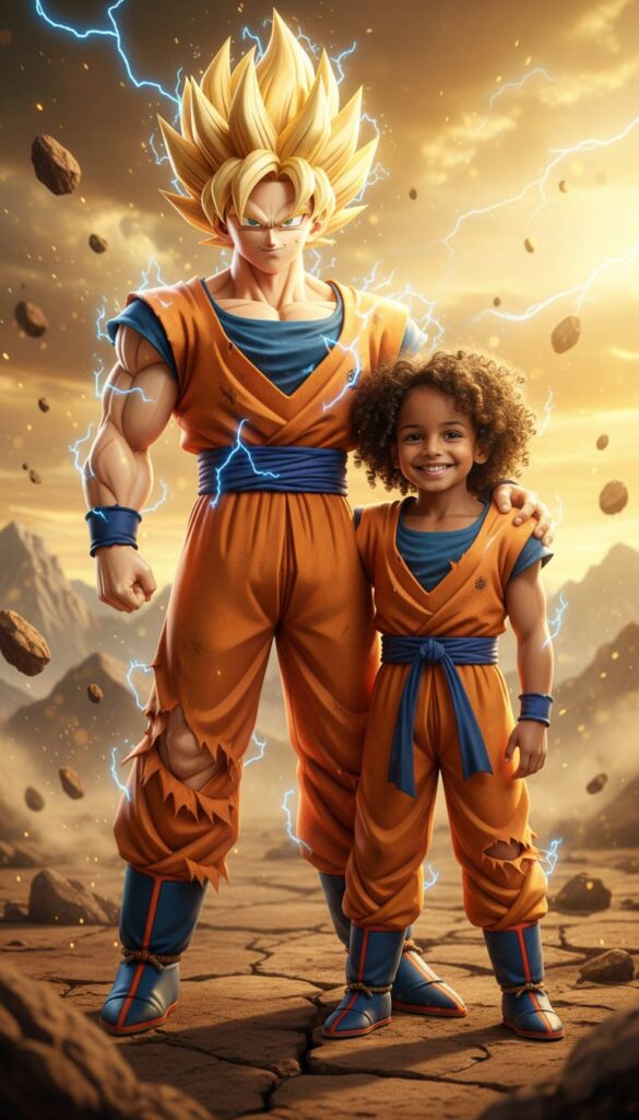Crie uma imagem, com a foto enviada, cinematográfica em 8K ultrarrealista de uma criança humana totalmente real, mantendo fisionomia, pele, cabelo e proporções naturais. A criança está ao lado de Goku Super Saiyajin 2 em estilo 3D realista, ambos sorrindo e olhando diretamente para a câmera em uma cena épica e calorosa.Pose: os dois estão lado a lado, sorridentes, com o braço direito de Goku sobre o ombro da criança, e a criança abraçando a cintura de Goku. Expressão alegre e confiante em ambos, transmitindo amizade e energia positiva.Cenário: planície rochosa realista inspirada em Dragon Ball Z, com montanhas distantes, chão rachado e pequenas pedras suspensas pelo poder. O céu é dourado e turbulento, com relâmpagos azuis e energia dourada pulsando ao redor dos personagens. Poeira e vento adicionam movimento à cena.Iluminação: luz épica cinematográfica, mistura de tons quentes dourados e frios azulados. Reflexos intensos do brilho Super Saiyajin 2 iluminam o rosto da criança e os detalhes do cenário. Efeito glow leve em torno de Goku, iluminação volumétrica e flare natural vindo do fundo.Câmera: Canon EOS R5 simulada, lente 50mm f/1.8, foco nítido nos rostos, fundo com bokeh suave e leve desfoque atmosférico. Ângulo frontal baixo e inclinado para cima, criando sensação de escala heroica e conexão emocional.Estilo: 3D cinematográfico ultrarrealista, com texturas PBR e renderização física de materiais. Goku possui músculos definidos, pele realista e cabelos dourados energizados, com fios detalhados e brilho elétrico. A criança é 100% realista, integrando-se naturalmente à cena.Roupa: a criança veste o mesmo traje de Goku — quimono laranja com faixa azul na cintura, camiseta azul por baixo e botas azuis com detalhes dourados. Tecidos com textura realista e leve desgaste de batalha.Color grading: paleta quente e vibrante com tons dourados, laranjas e azuis. Energia com brilho HDR e partículas douradas no ar, contraste cinematográfico e atmosfera épica.Qualidade: renderização 8K, PBR, HDR, luz volumétrica, dispersão subsuperficial na pele, microdetalhes em tecido, metal e cabelo, foco extremo e nitidez.Tom geral: épico, heroico e inspirador — fusão cinematográfica entre realidade e fantasia, mostrando a criança humana realista ao lado de Goku Super Saiyajin 2 em 3D realista, dentro de um cenário grandioso e iluminado por energia.