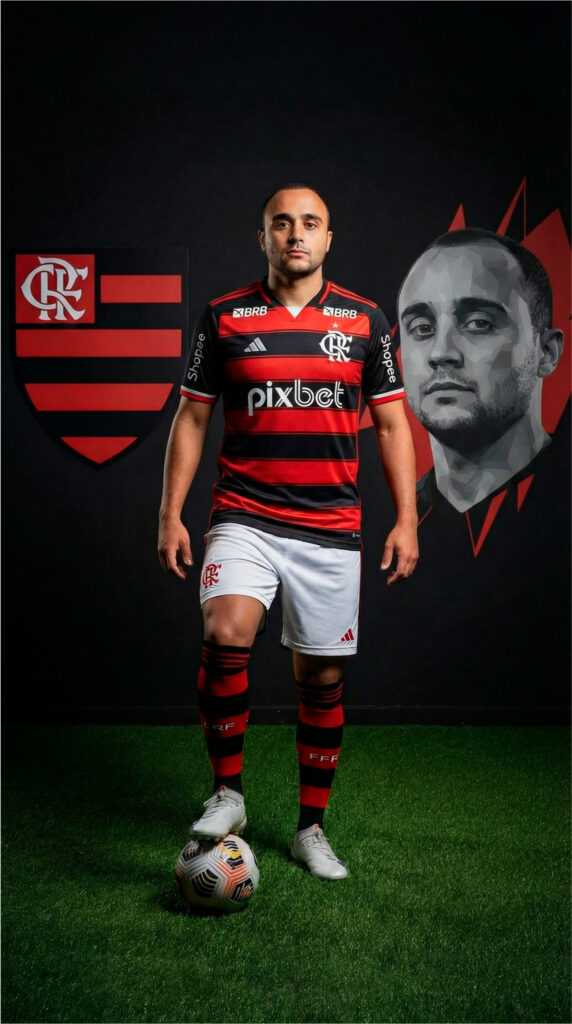 Crie uma imagem épica e ultrarrealista baseada na foto de referência. Fotografia esportiva profissional de corpo inteiro, enquadramento médio-afastado, jogador de futebol em pé em estúdio. Substituir o rosto pelo meu rosto real, preservando 100% da fisionomia original (proporções faciais, maxilar, nariz, boca, olhos, sobrancelhas, tom e textura da pele, cabelo e traços únicos), sem qualquer estilização facial.Pose: postura confiante, corpo levemente inclinado para trás, uma perna firme no chão e a outra flexionada com o pé apoiado sobre uma bola de futebol, braços relaxados ao lado do corpo.Câmera: posicionada entre cintura e peito, ângulo frontal levemente baixo, transmitindo imponência esportiva.Iluminação: estúdio cinematográfico, luz principal suave frontal-lateral, sombras controladas, contraste equilibrado, fundo propositalmente mais escuro.Configuração: foco extremamente nítido no jogador, fundo levemente desfocado, profundidade de campo moderada, sem motion blur.Lente: 35mm, proporções realistas de corpo inteiro.Estilo: fotografia esportiva realista, estética de pôster oficial de futebol profissional.Qualidade: ultra high quality, 8K HDR, hiper-realismo, nitidez extrema, texturas detalhadas de tecido, pele e materiais.Roupa: camisa listrada horizontal vermelho e preto com gola preta, shorts brancos, meias pretas com detalhes vermelhos e azuis, chuteiras brancas modernas.Cenário: parede preta fosca ao fundo com escudo do Flamengo à esquerda, retrato artístico do jogador à direita em tons de cinza com efeito geométrico/poligonal, elementos gráficos vermelhos angulares; chão com grama artificial verde realista.Color grading: cinematográfico, contraste médio-alto, vermelhos e pretos intensos, sombras profundas, leve vinheta, visual limpo e profissional.Render final: imagem esportiva épica, realismo extremo, presença forte, identidade visual marcante, digna de campanha promocional profissional.