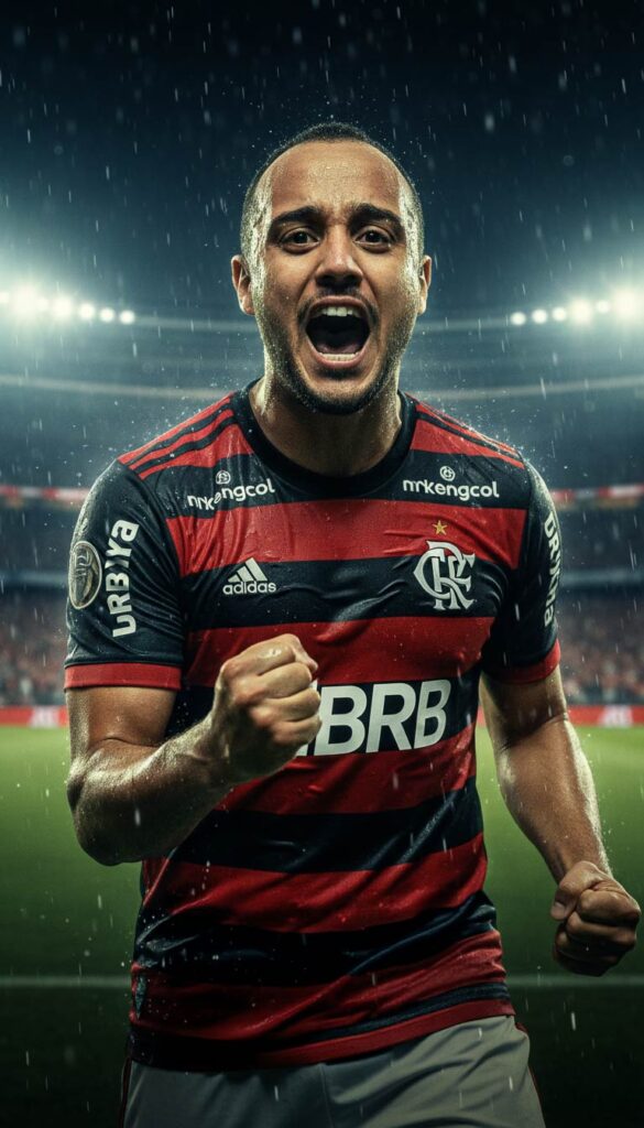 Crie uma imagem épica ultrarrealista em estilo cinematográfico, com a foto enviada, em plano médio fechado.Fisionomia: preservar fielmente a fisionomia, proporções faciais, tom de pele, e traços únicos do rosto enviado, sem alterações desnecessárias. Estilo: pôster esportivo cinematográfico, atmosfera épica de comemoração em estádio de futebol noturno.Pose: corpo capturado da cintura para cima; braço esquerdo dobrado em 90°, punho cerrado junto ao ombro; braço direito estendido para fora, punho cerrado; tronco levemente inclinado para frente, boca aberta em expressão de euforia intensa, transmitindo vitória e energia. Roupa: uniforme do flamengo, camisa vermelha e preta do flamengo; logo do Flamengo estilizado no lado direito do peito; emblema esportivo estilizado no lado esquerdo do peito; textura realista de tecido esportivo molhado pela chuva. Cenário: estádio noturno cheio, torcida borrada e desfocada ao fundo; gotas de chuva visíveis em primeiro plano; iluminação de refletores fortes de estádio. Iluminação: luz dramática e cinematográfica de estádio, key light principal iluminando o rosto e peito, contraste com sombras suaves nas laterais, reflexos molhados realistas na pele e camisa. Configuração da câmera: foco extremo no jogador, fundo desfocado (bokeh cinematográfico), chuva parcialmente congelada no ar; sem distorções. Câmera: emulação Canon EOS R5, lente RF 85mm f/1.8, abertura f/1.8, ângulo frontal levemente de baixo para cima, perspectiva épica. Estilo de arte: ultrarrealista, fotografia esportiva cinematográfica. Modificadores de qualidade: 8K, HDR, foto de estúdio cinematográfico, detalhes de pele com dispersão de subsuperfície, microdetalhes de tecido e iluminação, atmosfera volumétrica realista. Color grading: tons vibrantes amarelo e verde da camisa contrastando com fundo azulado do estádio, iluminação fria das luzes com contraste quente nos reflexos da pele, atmosfera épica de chuva.