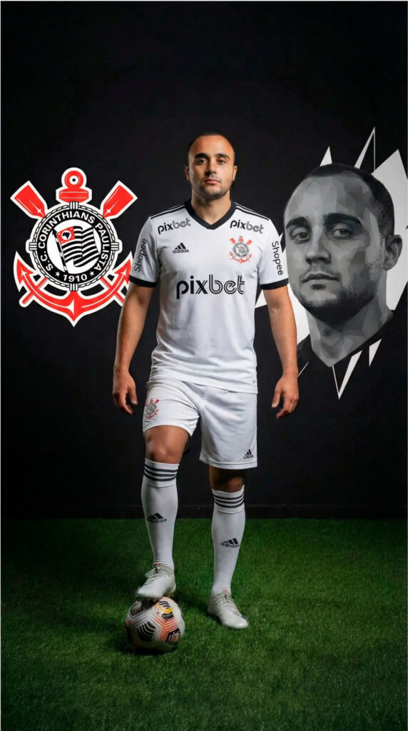 Crie uma imagem épica e ultrarrealista, baseada na foto de referência, em fotografia esportiva profissional. Jogador de futebol em pé, corpo inteiro em enquadramento médio-afastado, postura confiante, corpo levemente inclinado para trás, um pé apoiado sobre a bola e o outro firme no chão, braços relaxados ao lado do corpo.Câmera: ângulo frontal levemente baixo, posicionada entre cintura e peito, lente 35mm, foco extremamente nítido no jogador, fundo levemente desfocado, profundidade de campo moderada.Iluminação: estúdio cinematográfico profissional, luz principal suave frontal-lateral destacando rosto e uniforme, sombras controladas, fundo propositalmente mais escuro.Rosto (EXTREMAMENTE IMPORTANTE): substituir o rosto do jogador pelo meu rosto real, preservando 100% da fisionomia original, proporções faciais, maxilar, nariz, boca, olhos, sobrancelhas, tom e textura da pele, cabelo e traços únicos, sem estilização ou alterações faciais.Uniforme: camisa branca com gola preta, shorts brancos, meias brancas com detalhes pretos, chuteiras brancas modernas, bola de futebol profissional no chão.Cenário: parede preta fosca ao fundo com escudo do Corinthians à esquerda e retrato artístico do próprio jogador à direita em tons de cinza com efeito geométrico/poligonal; elementos gráficos angulares em branco, cinza e preto; chão com grama artificial verde realista.Estilo e acabamento: fotografia realista esportiva, estética de pôster oficial de futebol, 8K, HDR, ultra high quality, hiper-realismo, texturas detalhadas de pele e tecido. Color grading cinematográfico, contraste médio-alto, tons vermelhos e pretos intensos, sombras profundas, leve vinheta, visual limpo e profissional.Render final: imagem esportiva épica, presença forte, identidade visual marcante, realismo extremo, digna de campanha promocional profissional de clube europeu.