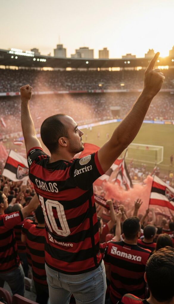 Crie uma imagem épica ultrarrealista em estilo cinematográfico, com a foto enviada, em plano médio fechado.Fisionomia: preservar fielmente a fisionomia, proporções faciais, tom de pele, e traços únicos do rosto enviado, sem alterações desnecessárias. Modificador de fotografia: plano médio documental cinematográfico, tirado de trás e levemente de perfil lateral, destacando o personagem imerso no meio da torcida, conectado com a multidão e o estádio lotado ao fundo. Pose: homem de pé no meio da multidão, braços erguidos em vibração intensa, corpo levemente inclinado para frente, expressão de emoção, orgulho e paixão, transmitindo energia coletiva e celebração épica. Posição da câmera: câmera em nível do ombro, levemente acima da linha dos olhos, ângulo diagonal capturando o personagem integrado entre os torcedores, transmitindo pertencimento e atmosfera grandiosa. Iluminação: natural, dourada e quente do pôr do sol, incidindo lateralmente sobre rosto e camisa. Contraste cinematográfico entre áreas iluminadas e sombras suaves, criando atmosfera calorosa e vibrante. Configuração da câmera: foco nítido no personagem, multidão e bandeiras em leve desfoque para dar profundidade. Nitidez extrema no rosto e corpo, mas mantendo sensação de integração com o público. Tipo de lente: grande angular 35mm, captando amplitude do estádio, multidão e horizonte ao pôr do sol. Estilo de arte: realismo ultrarrealista, fotografia cinematográfica, estilo pôster épico. Qualidade: 8K, HDR, ultrarrealista, fotografia profissional, renderização PBR, microdetalhes em pele, cabelo e tecido. Roupa do personagem: camisa de futebol preto e vermelho do Flamengo, número “10” em branco nas costas com a palavra “CARLOS” acima. Calça jeans azul-clara. Sem boné, cabelo visível com fidelidade total. Color grading e efeitos: gradação de cor quente e cinematográfica, tons dourados e alaranjados do pôr do sol, atmosfera épica com luz volumétrica. Reflexos dourados realçando bandeira do Flamengo da torcida. Cenário: estádio cheio, arquibancadas lotadas, torcedores vibrando com bandeiras preto e vermelho do Flamengo, fumaça vermelha e cinza, campo visível com gol iluminado. Skyline urbano ao fundo sob luz dourada do pôr do sol. Fisionomia: preservar 100% a identidade original do rosto do personagem, sem alterações ou interpretações. Resultado final: cena épica, imersiva e cinematográfica, vibrante, transmitindo paixão, orgulho e energia coletiva da torcida.