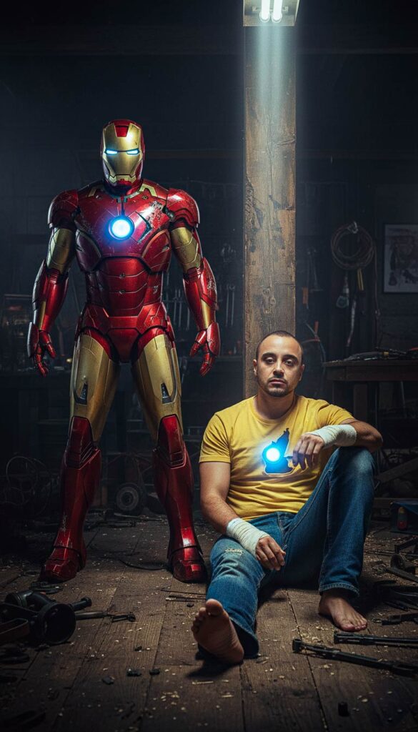 Crie uma imagem ultrarrealista em estilo cinematográfico, atmosfera épica.Fisionomia: preservar fielmente a fisionomia, proporções faciais, tom de pele, e traços únicos do rosto enviado, sem alterações desnecessárias.Estilo: pôster de filme de super-herói, fotografia dramática e cinematográfica, atmosfera épica.Pose: homem sentado no chão, encostado em uma coluna de madeira, corpo levemente inclinado para trás, pernas esticadas parcialmente para frente. Braço direito com faixa branca de bandagem enrolada nas mãos, mão esquerda apoiada na perna. Expressão séria, olhando para a câmera.Roupa: camiseta amarela simples com um reator arc brilhante no centro do peito, calça jeans, pés descalços. A camisa está rasgada na parte do reator arc brilhante, mostrando uma fusão perfeita do reator arc com a pele de homem.Cenário: oficina de madeira escura, chão de madeira rústico, ferramentas espalhadas em segundo plano, iluminação dramática. Ao lado esquerdo, armadura completa do Homem de Ferro (vermelha metálica com detalhes dourados e arranhados, reator arc brilhando).Iluminação: luz dramática de cima, feixe branco vindo de uma lâmpada fluorescente, iluminando parcialmente o rosto e o peito. Contraste entre áreas escuras e iluminação dura. Atmosfera cinematográfica.Configuração de câmera: fundo levemente desfocado, foco nítido no rosto e na armadura ao lado. Profundidade de campo curta, atmosfera cinematográfica, textura realista do ambiente.Tipo de lente: lente 50mm, abertura f/1.8, captura em plano médio, altura dos olhos, perspectiva frontal. Estilo de arte: ultrarrealista, fotografia cinematográfica.Modificadores de qualidade: foto 8K, HDR, iluminação de estúdio dramática, detalhes PBR, texturas de madeira e metal hiper-realistas, microdetalhes na pele e tecido, nitidez extrema.Color grading: tons quentes e metálicos no Homem de Ferro contrastando com sombras frias no ambiente, leve vinheta escura, atmosfera intensa de pôster cinematográfico.